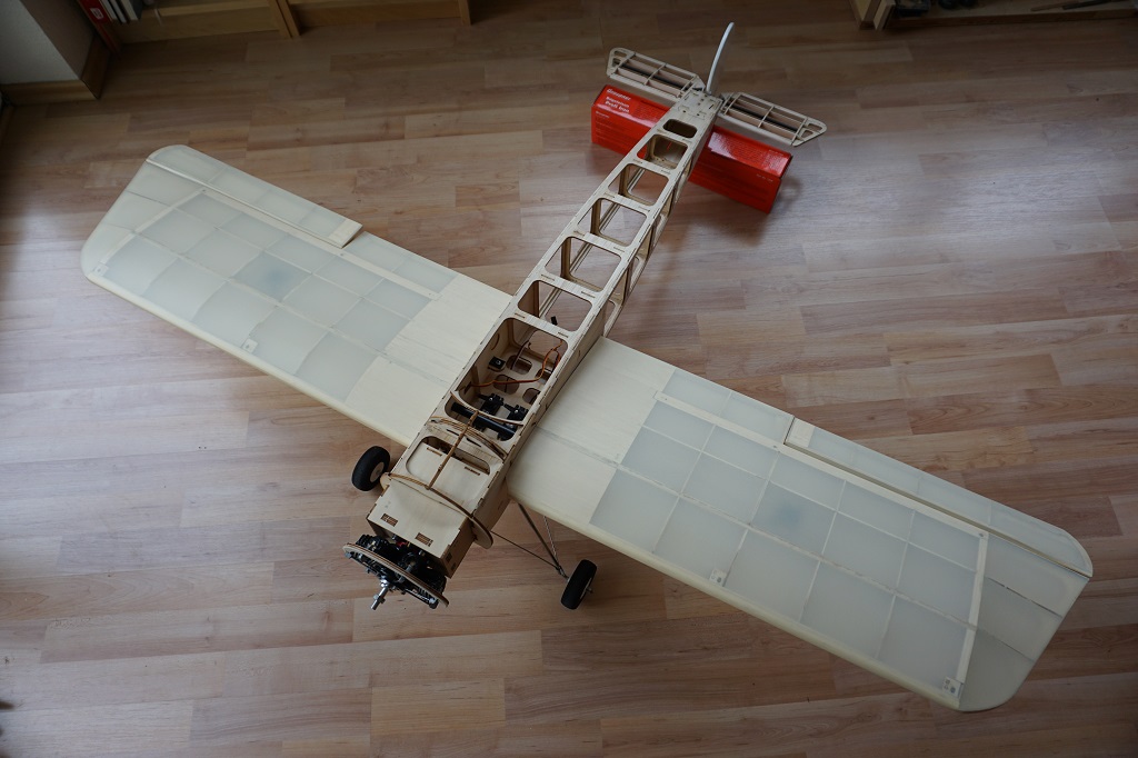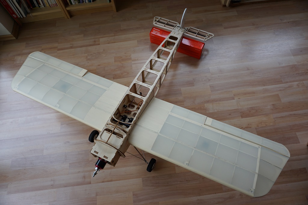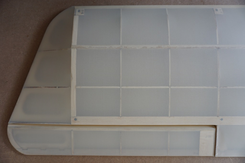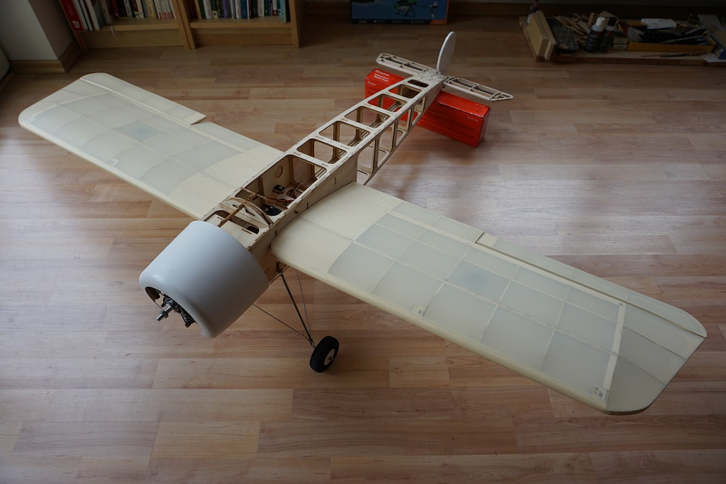 Flächen und Querruder sind bespannt, die Ruder sind mit